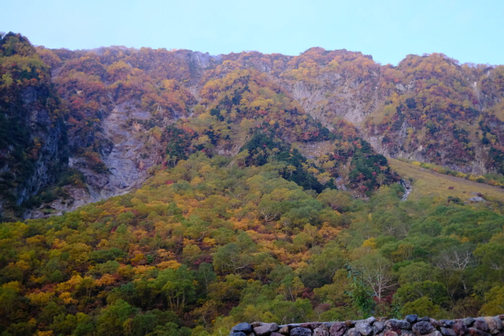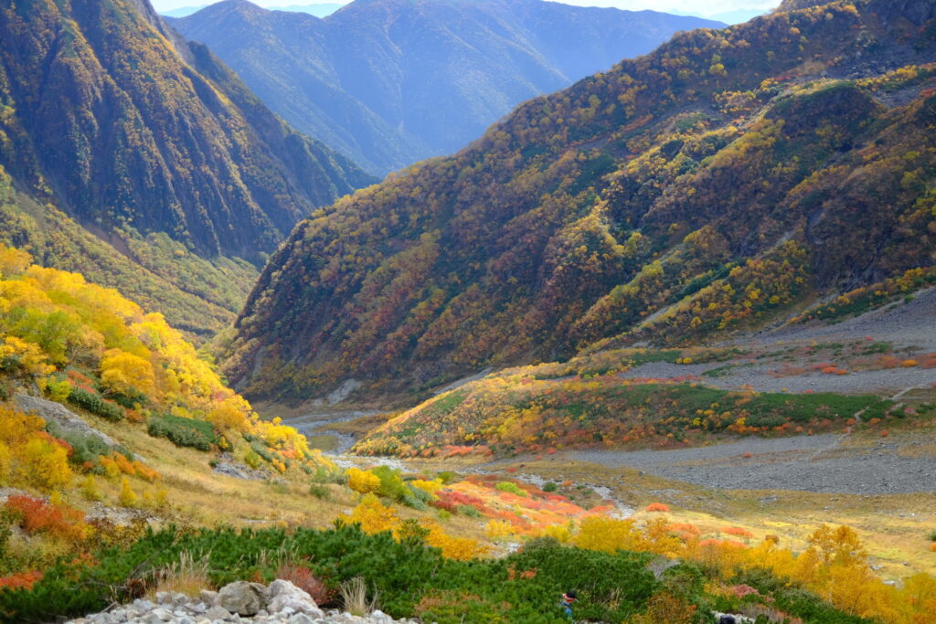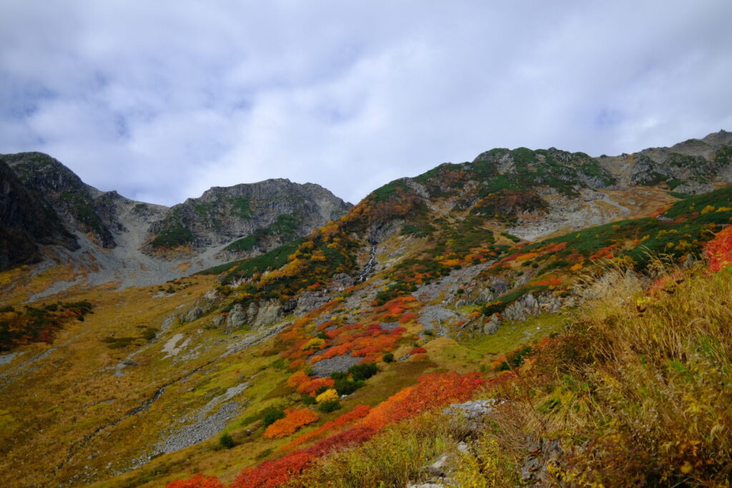 槍ヶ岳までの山行は紅葉の中をひたすらに登って行く道のりでした。