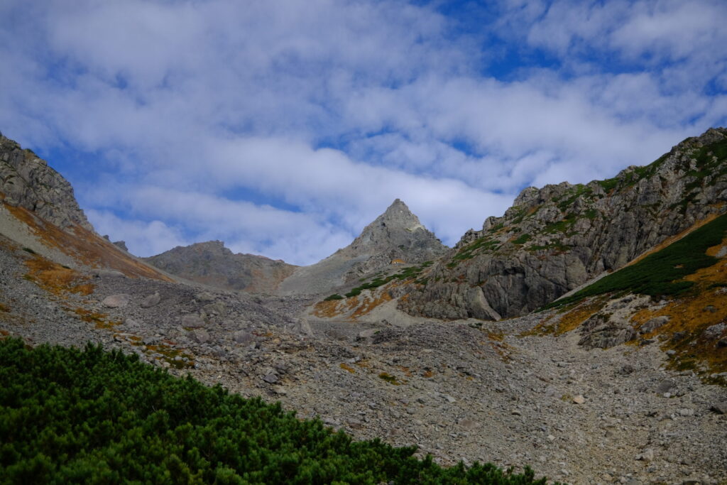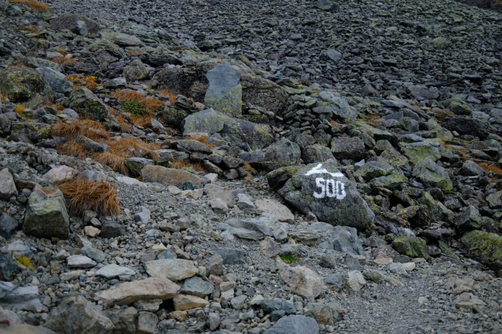 空が少しずつ明るくなる中でこれから目指す槍ヶ岳を彷彿とさせるポイントにつき、テンションが上がります。これからこの山を目指して乗るんだ!と決意を新たに進んでいきます。