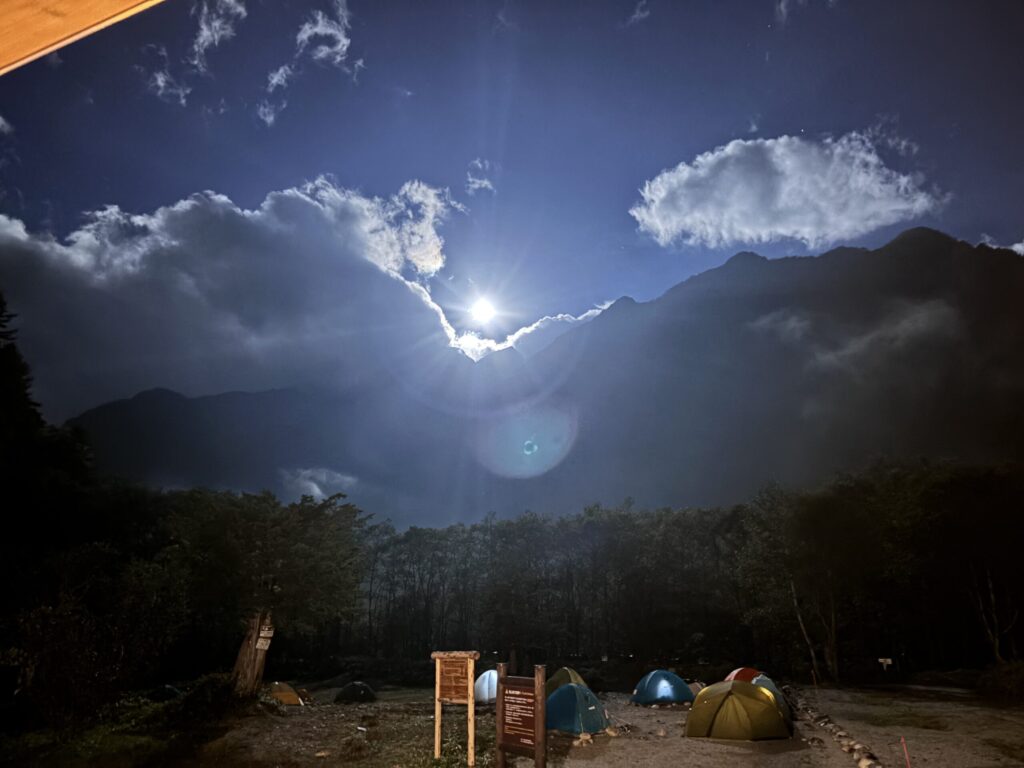 ヘッドライトを頼りに進んでいきます。横尾から槍沢ロッジまでの道は比較的に平坦。足場は土で、川の横をひたすらに緩く進みました。