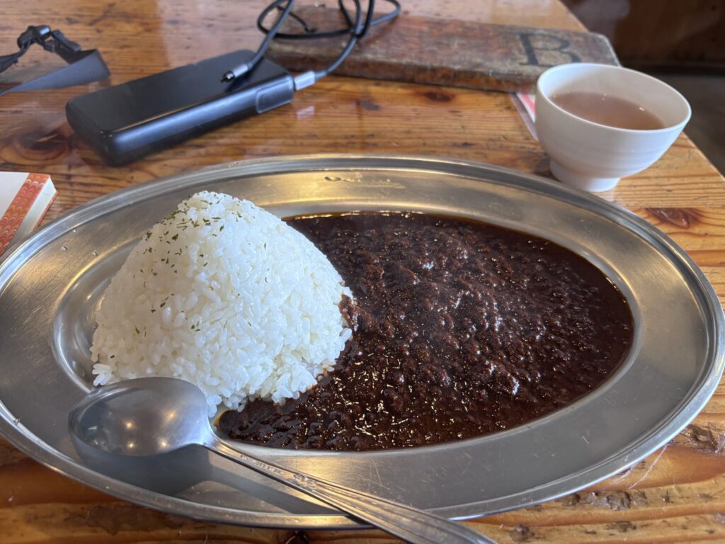 天候悪くて、真っ白の中テント立てて、山小屋でカレー食べました。