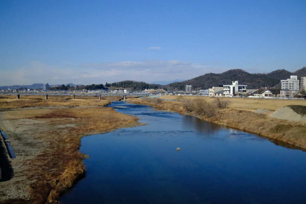 冷たく澄んだ冬の空気の中、渡良瀬川にかかる橋を渡ります。