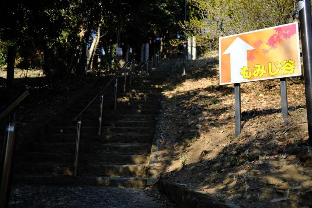 神社の裏手からハイキングコースに入ると、そこには静かな「もみじ谷」や「古墳」の看板が現れます。
