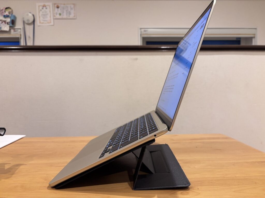 ひとつは、PCに角度をつける**「MOFT」のスタンド**です。 あえて「PCに貼らないタイプ」を選んでいたことで、会社の仕事用PCとこのMacBook Air、どちらにもシームレスに使い回すことができています。どこでも常に「私だけのタイピング角度」が再現できる、最強の相棒です。