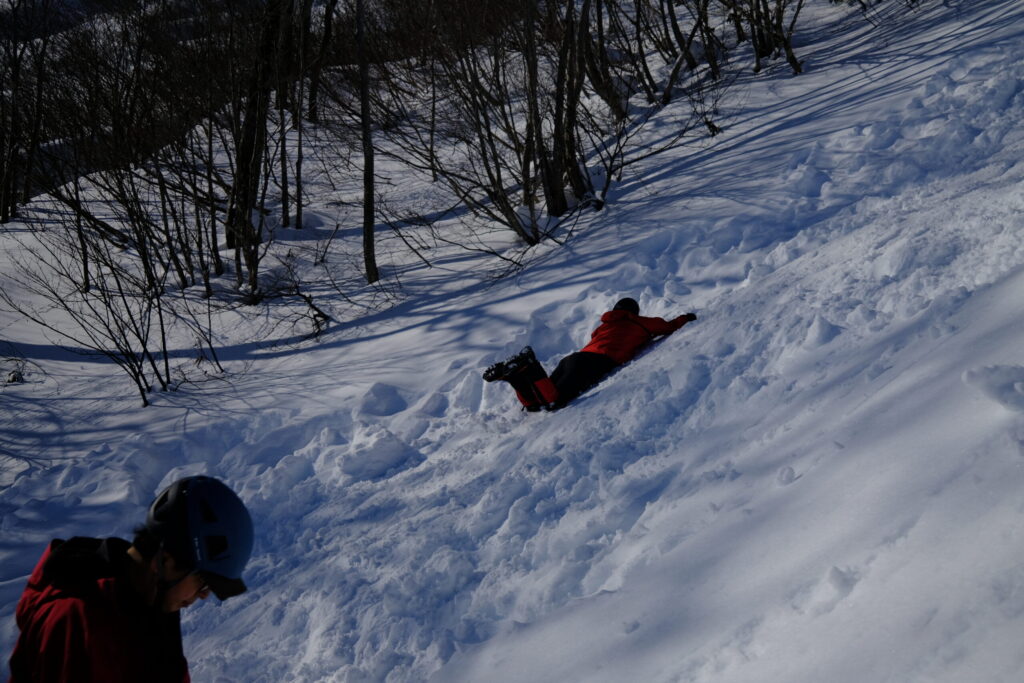 利き手での制動は比較的スムーズに覚えられましたが、本当の恐怖は「頭から逆さまに滑り落ちる」シミュレーションでした。視界が上下に揺れ、加速していく中で、咄嗟に体が反応しません。私は一度、ピックで雪を捉えきれず、そのまま滑落してしまいました。